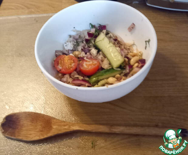 Это блюдо Лаосской кухни мне приглянулось по трем причинам. Во-первых, салатов с хрустящим жареным рисом.. ну... не бывает много. Во-вторых, интересна пикантная кисло-сладкая заправка на основе рыбного соуса, которая придает овощам и рису необычный, элегантный вкус. Ну и в третьих, в салате присутствует набор свежих, сочных овощей и трав, которые являются источником витаминов в любое время года.